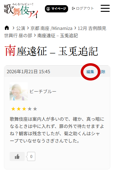右上の「編集」をクリックするとレビューを編集できます。