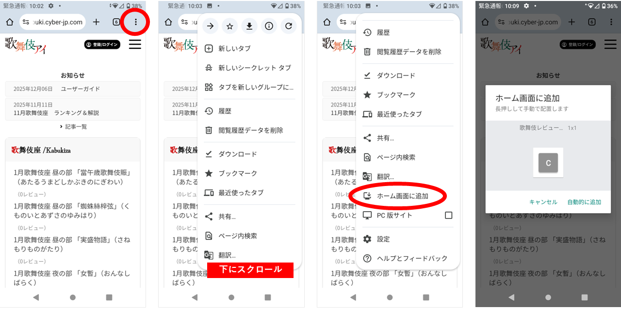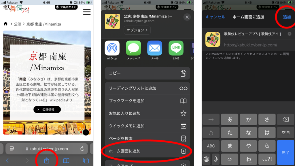 「歌舞伎アイ」は、スマホのホーム画面にも追加をして、ボタン表示ができます。いつでもワンクリックで「歌舞伎アイ」!