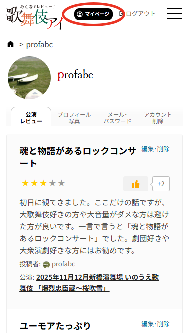 右上の「マイページ」をクリックしてマイページに移動してみてください。投稿したレビューの一覧を確認できます。投稿したレビューを編集や削除もできます。